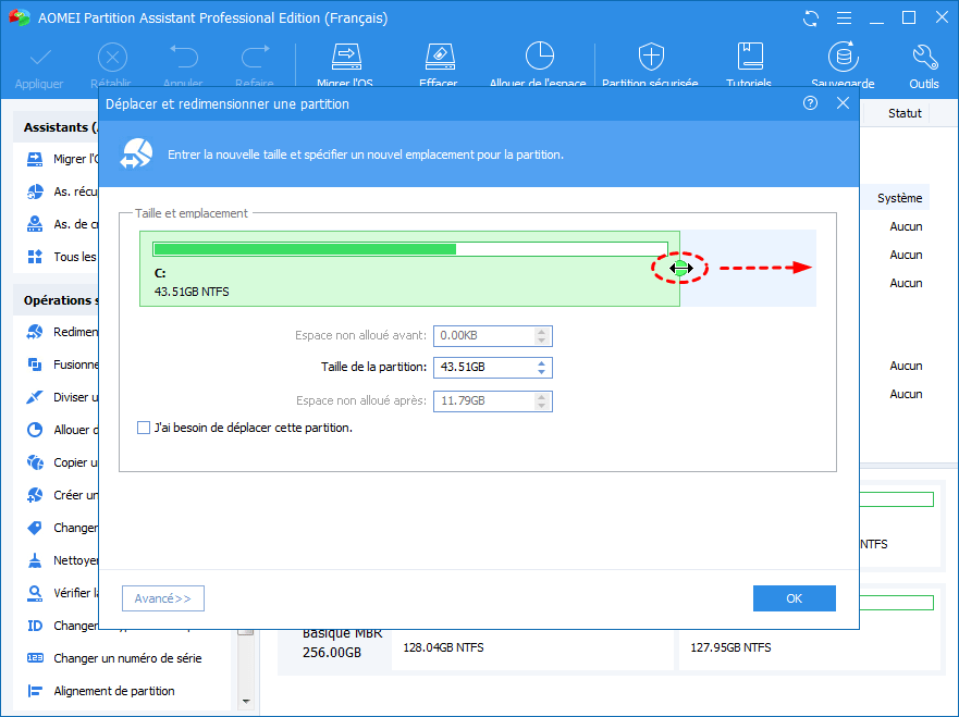2> Si l'espace non alloué n'est pas contigu, il suffit de faire un clic droit sur la partition avant l'espace non alloué, sélectionnez Redimensionner/déplacer la partition et utiliser la fonction Déplacer la partition pour rendre l'espace non alloué juste derrière la partition à étendre.
