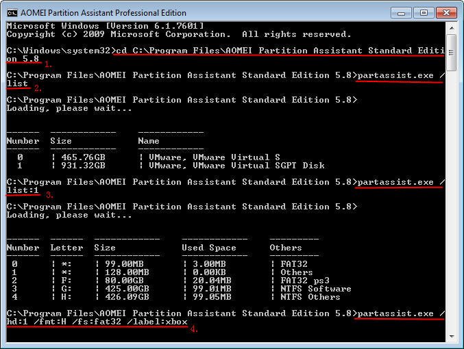 4). Tapez « ppartassist.exe/hd:1/fmt:H/fs:fat32/label:xbox » pour formater NTFS en FAT32.