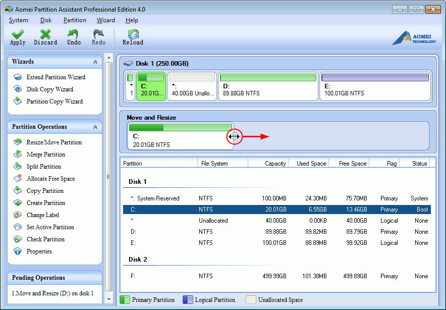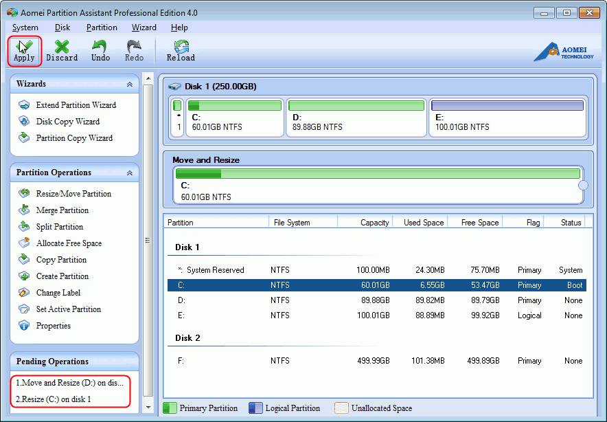 5. Ces deux opérations seront ajoutés aux "Opérations en attente", vous devez cliquer sur le "Appliquer" sur la barre d'outils pour exécuter les tâches. (Veuillez vous référer à la région rouge marquée de la capture d'écran suivante.)