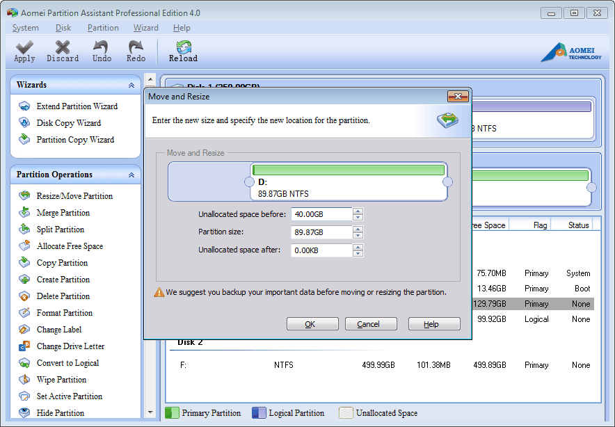 - B. Façon complexe: Réduisez la partition D: pour créer une nouvelle partition (par exemple E: lecteur), déplacer D: les données d'entraînement et les fichiers de E: dur, et d'appliquer "Supprimer le volume ..." dans le lecteur D:.