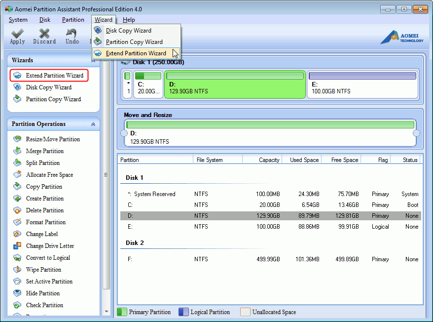 Étude de cas - Redimensionner la partition: Si vous avez besoin d'augmenter la taille de la partition système et il y a une partition à côté de lui, veuillez suivre les étapes ci-dessous: (Remarque: En supposons que vous ayez besoin d'étendre le lecteur C: et que le lecteur D: est à côté de lui)