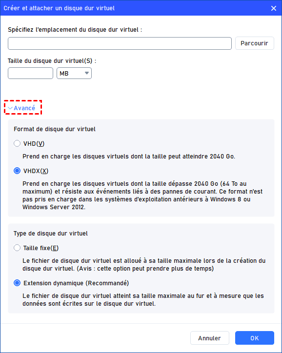 En option, cliquez sur « Avancé » pour définir le format et le type du disque dur virtuel. (Par défaut, le format VHDX et le type à extension dynamique sont sélectionnés.)