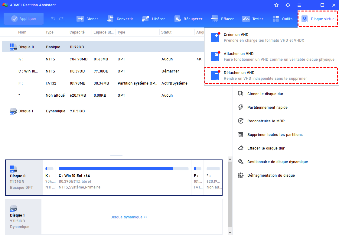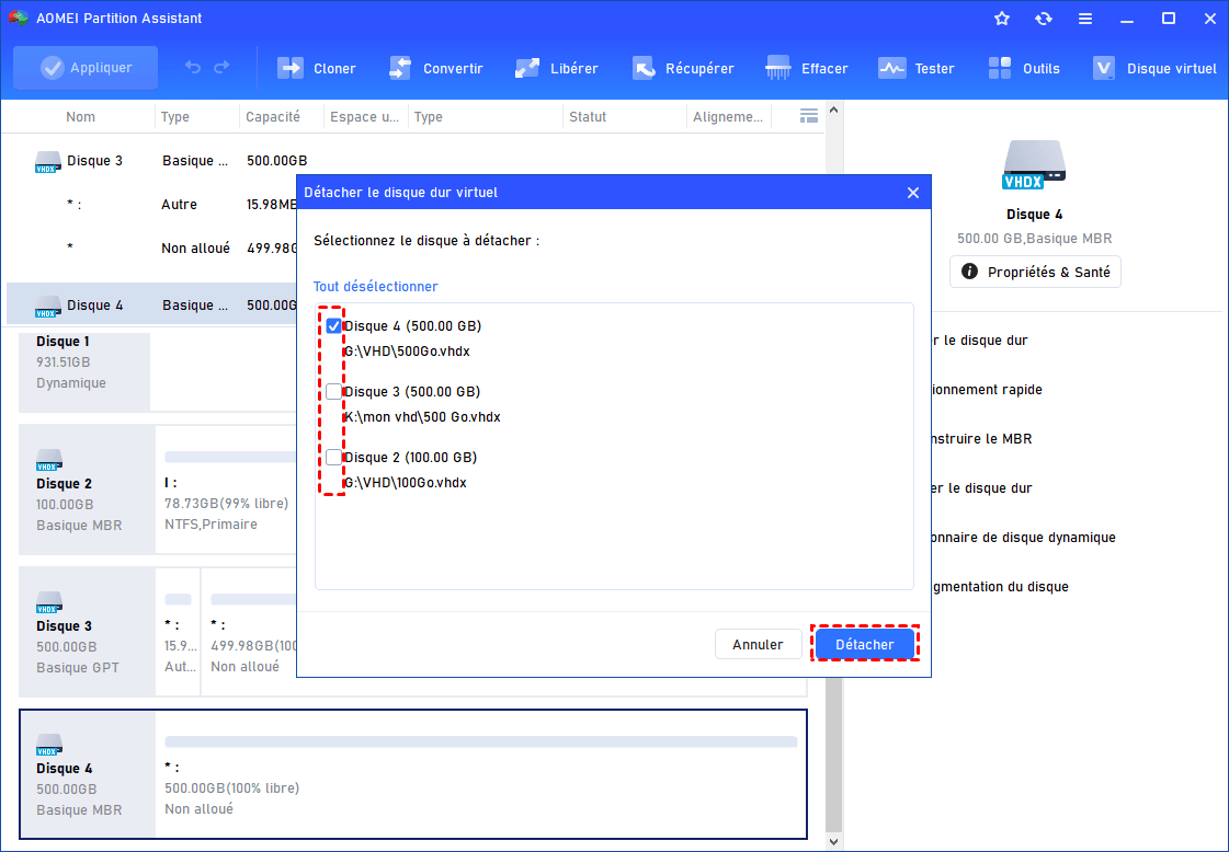 Vous pouvez faire un clic droit sur le VHD attaché dans Partition Assistant et sélectionner l’option « Détacher un VHD » pour le détacher.