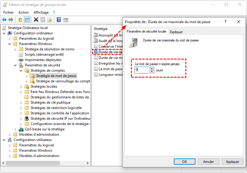 Étape 3 : Double-cliquez sur Durée de vie maximale du mot de passe et définissez sur 0 (ou une valeur adaptée) pour désactiver l’expiration.