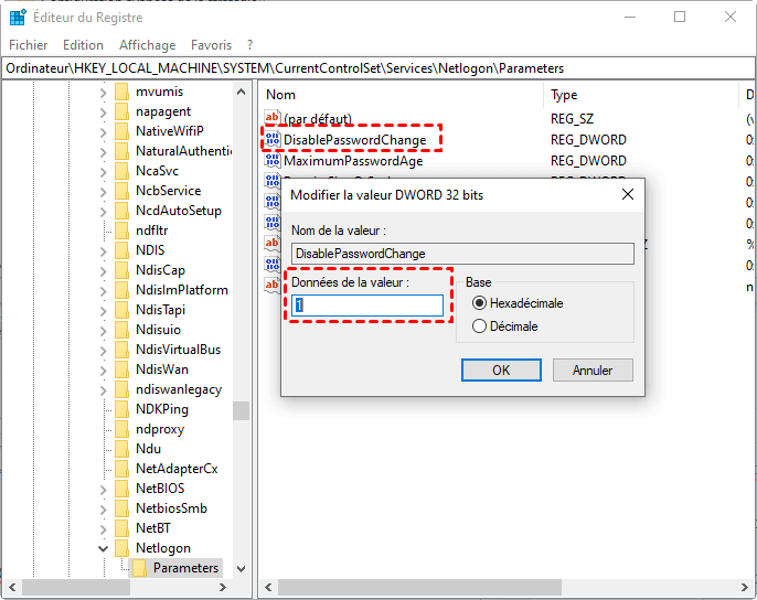 Méthode 5 — Modifier le Registre (DisablePasswordChanges) (environnements AD / Netlogon)