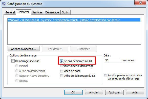 - Dans les options de démarrage, cochez "Ne pas démarrer le GUI" comme sur l'image ci-dessus.