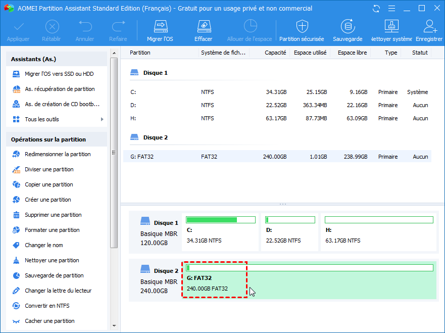 Si vous préférez changer le système de fichiers d'une partition sans perte de données, vous pouvez essayer AOMEI Partition Assistant Standard pour directement convertir NTFS en FAT32 sans perte de données. Il est compatible avec Windows 11/10/8/8.1/7/Vista/XP (à la fois 32 et 64 bits).
