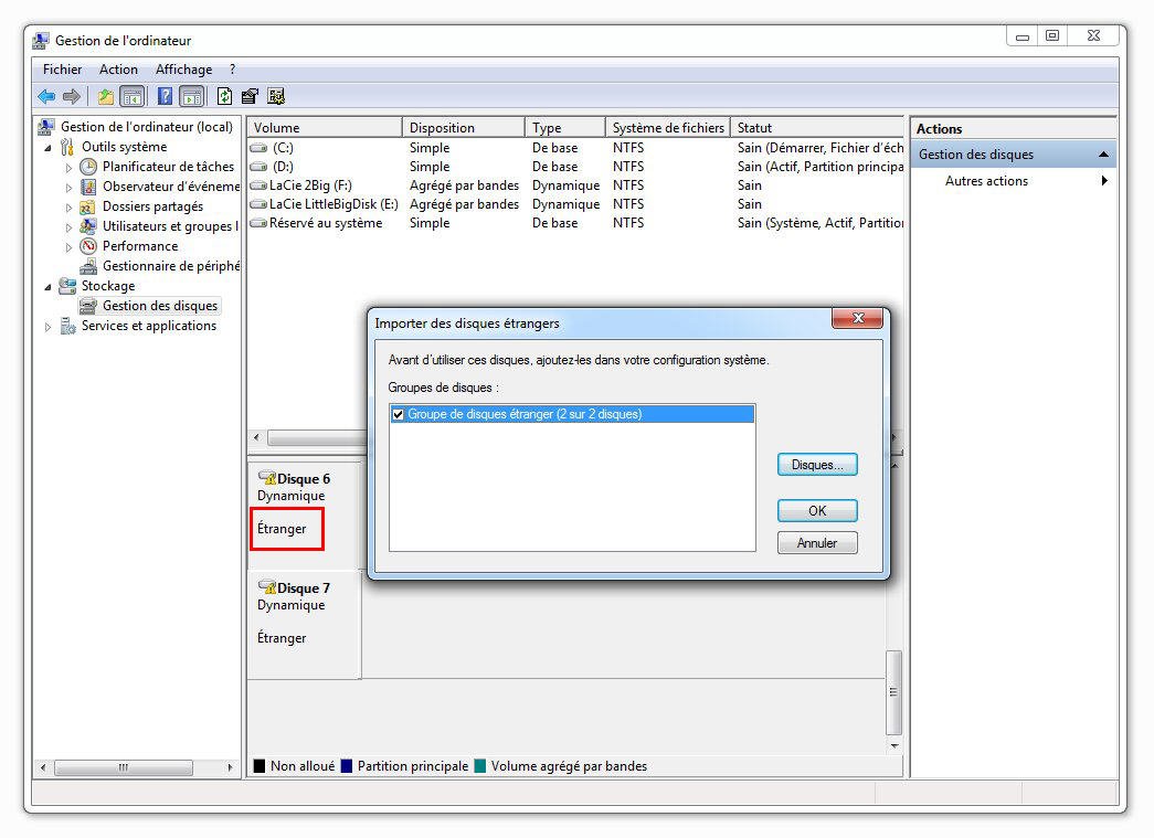 Question : J'ai mis à niveau vers Windows 7 64 bits Home Premium à partir de Windows XP avec deux disques durs. Le problème est que je ne peux pas lire le deuxième disque, bien qu'il apparaisse dans la configuration du BIOS. Dans Gestion d'ordinateur > Gestion des disques, il s'affiche comme un disque dynamique étranger sans autre information. Comment faire le lecteur comme statut dynamique est un problème. Vista Homme ne peut pas lire les disques dynamiques et je suppose que Windows 7 est aussi ne lit pas le disque dynamique. Mon problème est de savoir comment lire les données sur ce disque ?