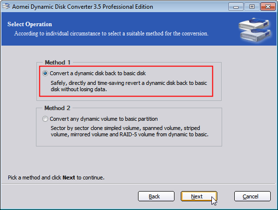 AOMEI Partition Assistant Professional est un gestionnaire de partition fiable qui possède Dynamic Disk Manger. C'est un gestionnaire puissant qui vous permet de convertir disque dynamique en base sans perte de données. Téléchargez la version Demo pour avoir un essai.