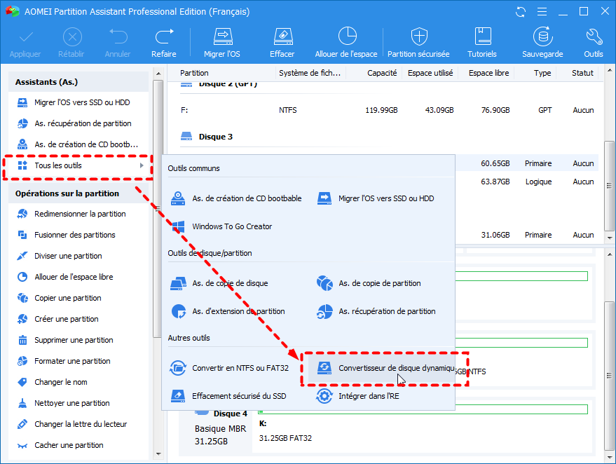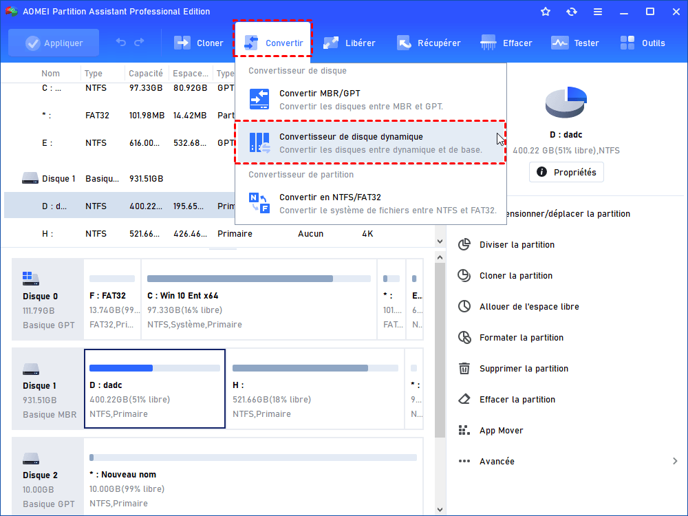 Vous pouvez utiliser le Convertisseur disque dynamique intégré dans AOMEI Partition Assistant.