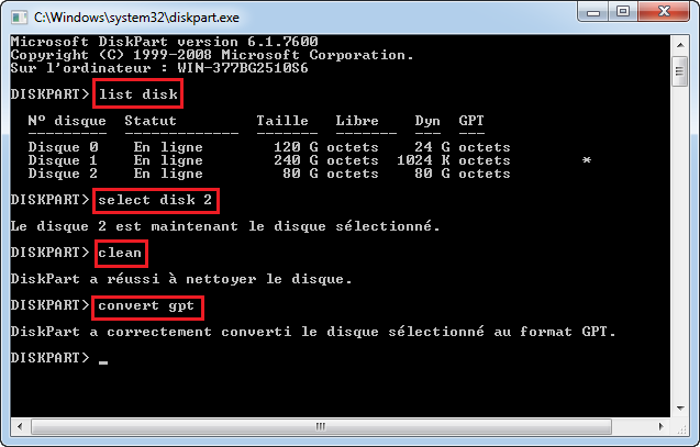 ● select disk 1 (1 est le numéro de disque du disque dur que vous souhaitez convertir)