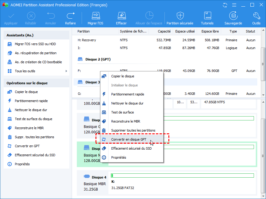 Il existe une manière plus facile pour changer le mode hérité en UEFI sans réinstaller Windows, si vous utilisez le logiciel AOMEI Partition Assistant Professional. Il vous permet de convertir un disque de système en MBR ou GPT sans affecter le système d'exploitation.