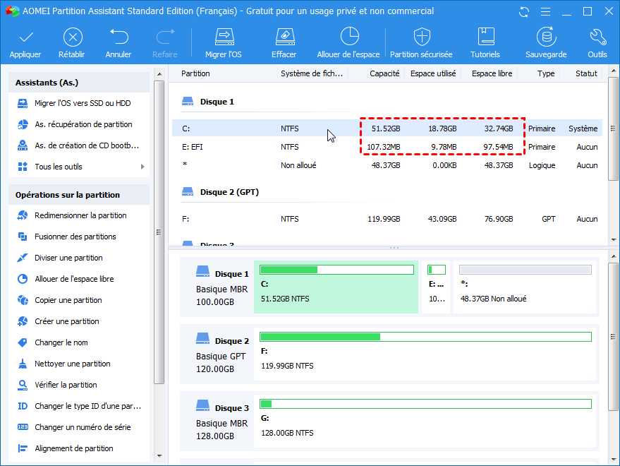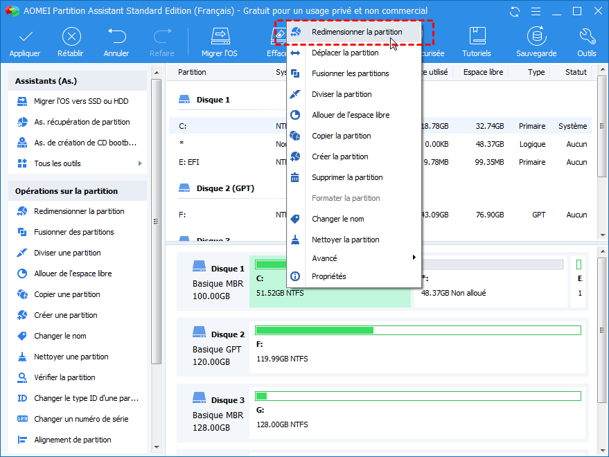 AOMEI gestion des partitions gratuit vous permet d'utiliser les fonctions ci-dessus ainsi que pour Windows 7/XP/Vista/2000 32 bits.