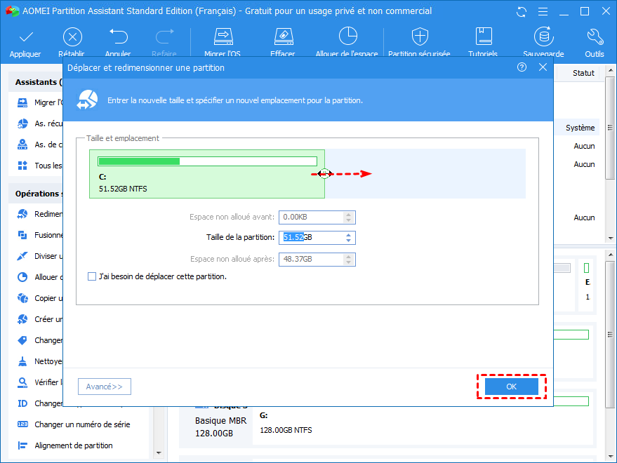 Ajouter de l'espace non alloué à la partition système Windows 7/Vista/XP/2000 : Le déplacement de l'espace non alloué est disponible afin que nous puissions fusionner l'espace non alloué à la partition système facilement.