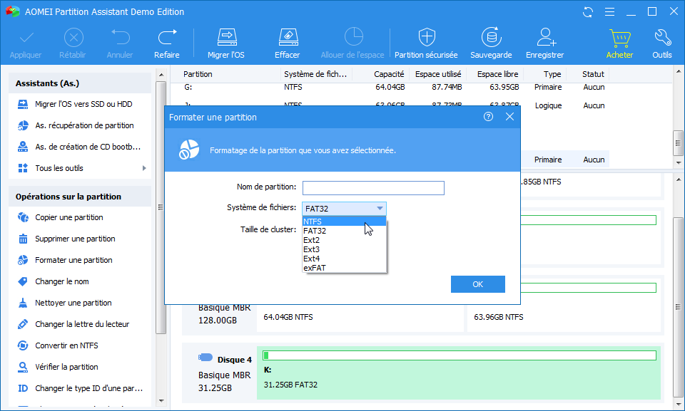 Il existe une solution plus facile et rapide pour résoudre le problème du formatage de carte SD bloquée – AOMEI Partition Assistant Standard. C'est un logiciel gratuit et puissant. Vous pouvez l'utiliser pour formater une clé USB, une carte SD, ainsi que tout autre lecteur de stockage dans Windows 11/10/8/7, Vista et XP.
