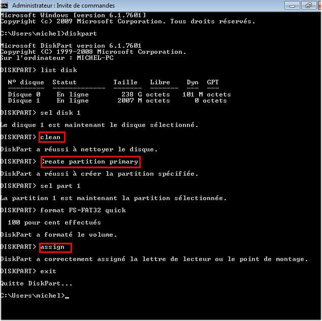 Étape 3.Entrez les lignes de commande dans l'image ci-dessous. D'abord il faut nettoyer la partition, puis une partition primaire sera créé. Ensuite, le reste des lignes de commande formateront le disque dur USB et activeront la partition sur celui-ci. La dernière étape est d'assigner la lettre de lecteur, ici choisissez E comme la lettre de lecteur.
