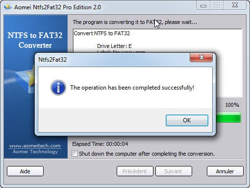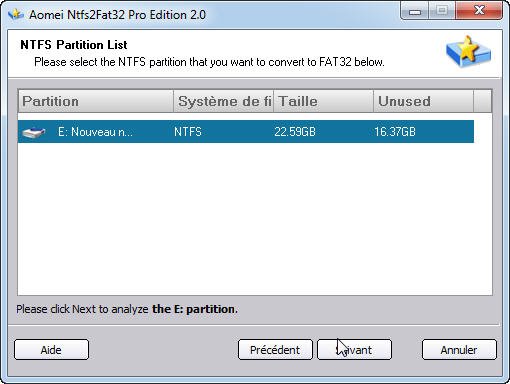 Nous avons obtenu la meilleure et la plus fiable façon de convertir NTFS en FAT32. AOMEI Partition Assistant Standard vous permet de convertir en FAT32 sans limitation de taille de partition, sans perte de données, gratuitement et facile à utiliser. Si vous souhaitez maintenir les partitions et les disques durs dans FAT32 ou NTFS, vous pouvez choisirAOMEI Partition Assistant Professional Edition.