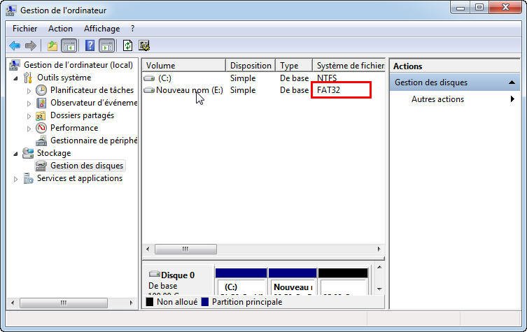 Ensuite, revenons à "Gestion des disques" pour vérifier le résultat. Comme indiqué, maintenant nous avons converti la partition de NTFS en FAT32 avec succès.