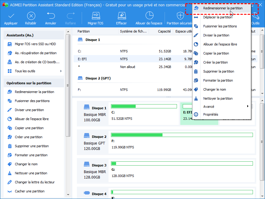 Il y a plusieurs façons de redimensionner la partition. Le DiskPart.exe (une commande DOS) et Gestion des disques pourrait vous aider à redimensionner la partition. Cependant, il y a encore quelques limitations d'entre eux. Ainsi de plus en plus d'utilisateurs choisissent gestionnaire de partition gratuit à gérer leur disque dur. AOEMI partition assistant Pro Edition est le dernier gestionnaire de partition conçu pour la version 32 bits ou 64 bits dans Windows 7. Redimensionner la partition fait partie de ce logiciel, même si la partition que vous souhaitez redimensionner est chiffrée, vous pouvez encore utiliser cette fonctionnalité pour la redimensionner.