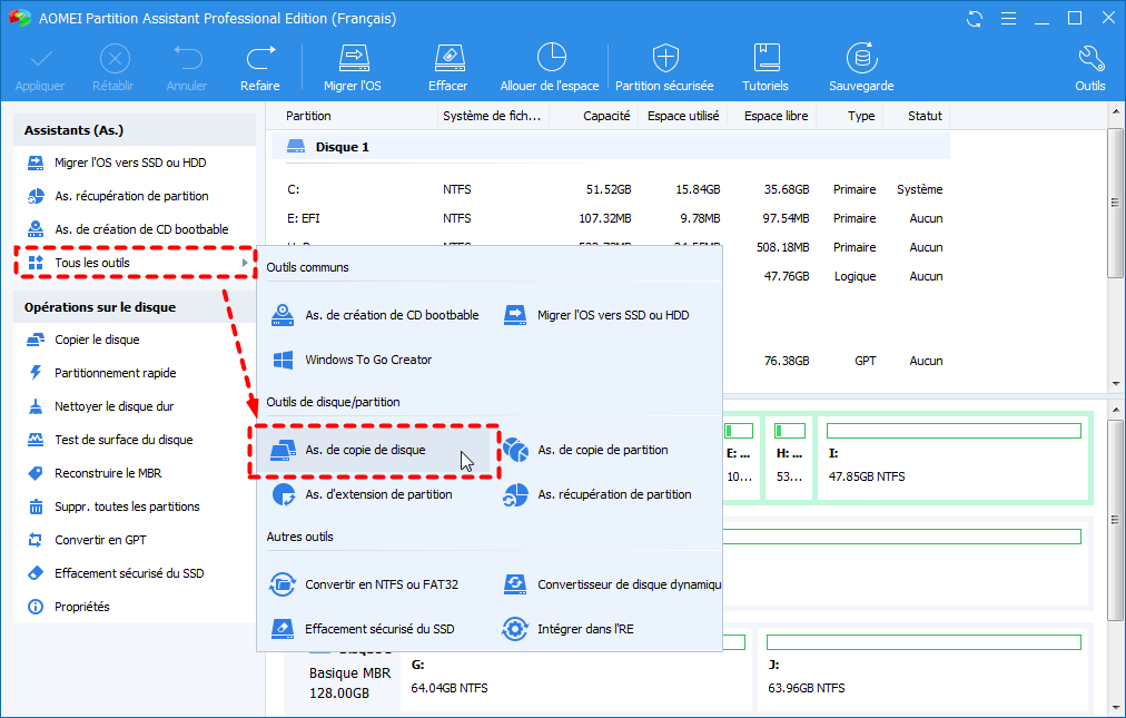 Les étapes pour cloner le disque avec ce logiciel gratuit sont très simples (La version Standard ne prend en charge que le clonage de disque dur de données, pour cloner le disque système, il faut passer à l'édition Professional) :