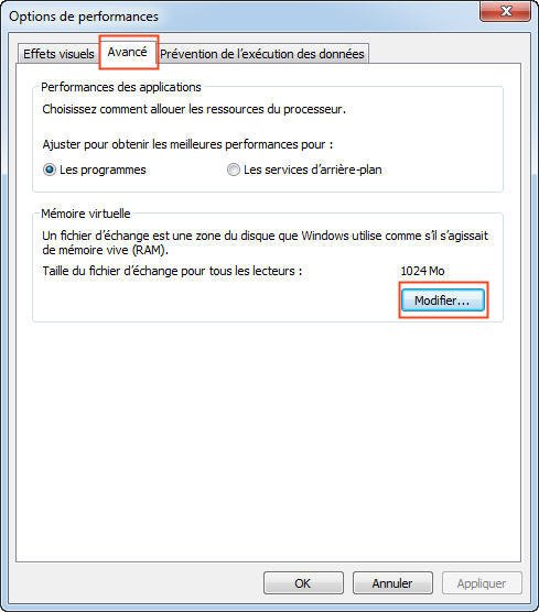 2. Dans la fenêtre Options de performances, cliquez sur l'onglet Avancé, et sélectionnez Modifier... dans la section Mémoire virtuelle.