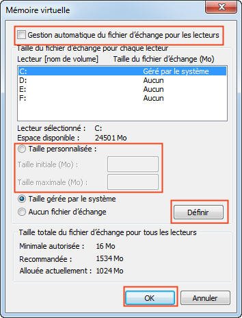 3. Ici, vous devez vous assurer que l'option de « Gestion automatique du fichier d'échange pour les lecteurs » n'est pas cochée. Ensuite, sélectionnez le lecteur avec Windows 10 installé, tapez une taille initiale et une taille maximale de la mémoire virtuelle. Ensuite, cliquez sur Définir et OK.
