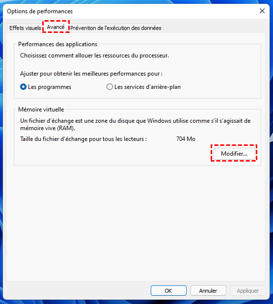 3. Dans la fenêtre Options de performances, cliquez sur Avancé, ensuite cliquez sur Modifier sous Mémoire virtuelle.