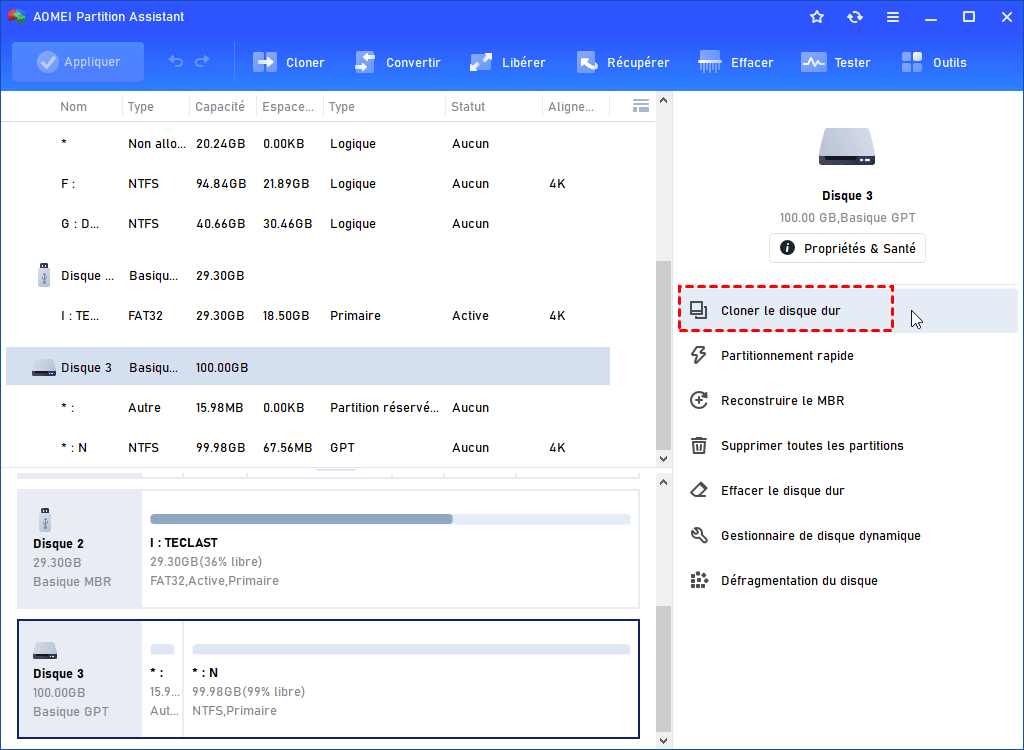 Étape 1. Téléchargez, installez et lancez ce logiciel gratuit. Cliquez sur le disque dur (eg. Disque3) que vous voulez cloner et sélectionnez Cloner le disque dur sur la barre à droite.