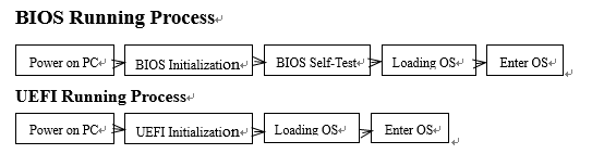 En règle générale, le BIOS Legacy utilise le MBR (Master Boot Record) pour stocker les informations du disque dur, tandis que l'UEFI utilise le GPT (GUID Partition Table). Le mode UEFI peut directement démarrer l’OS après l’initialisation sans le processus d’autotest du BIOS, aboutissant enfin à un démarrage plus rapide :