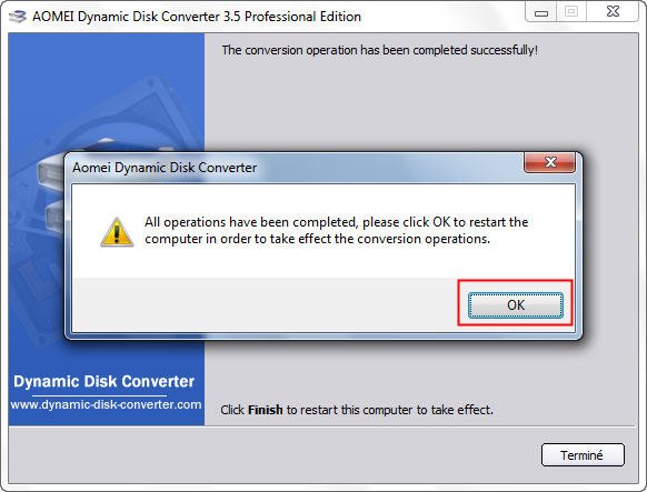 5. Lorsque la conversion est terminée, cliquez sur OK pour redémarrer votre ordinateur. Ensuite, vous verrez que le disque a été converti en disque de base.