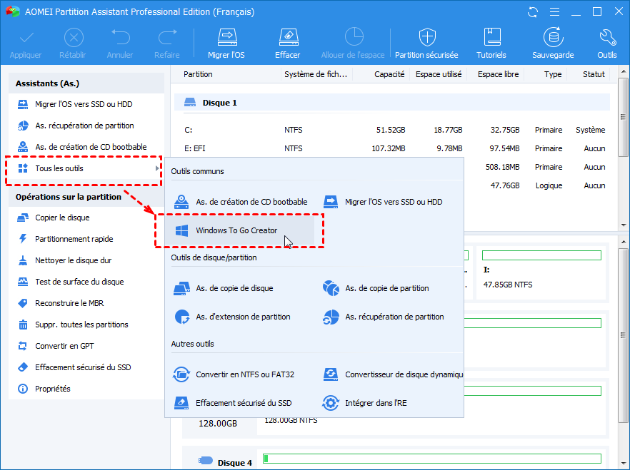 1. Installez et lancez AOMEI Partition Assistant Professional. Cliquez sur Outils en haut > Windows To Go Creator.