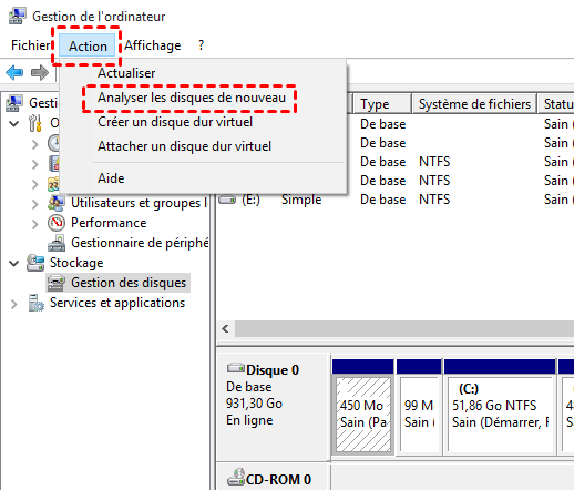 Faites un clic droit sur « Ce PC » et choisissez « Gérer », allez dans « Gestion des de l'ordinateur », cliquez sur « Action » dans la barre d’outils, puis sélectionnez « Analyser des disques de nouveau » pour permettre au système d’identifier à nouveau tous les disques connectés. Voyez si le lecteur D apparaîtra après cela.