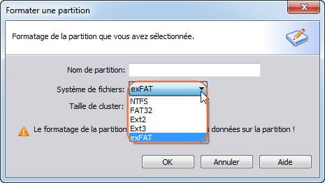 Étape 3. Dans la fenêtre pop-up, les systèmes de fichiers FAT32, NTFS, Ext2, Ext3 et exFAT sont disponibles. Ici, on choisit exFAT.