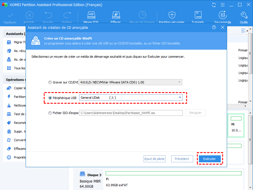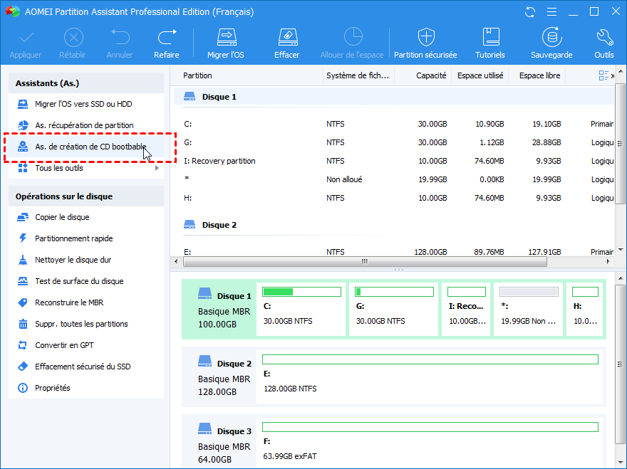 1. Connectez la clé USB sur votre PC Windows 10. Lancez AOMEI Partition Assistant Professional, puis sélectionnez Outils et As. De création de CD bootable en haut.