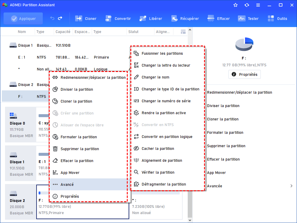 En plus de combler les lacunes de la gestion des disques, AOMEI Partition Assistant Standard est également livré avec de nombreuses fonctionnalités avancées que la gestion des disques n'offre pas.