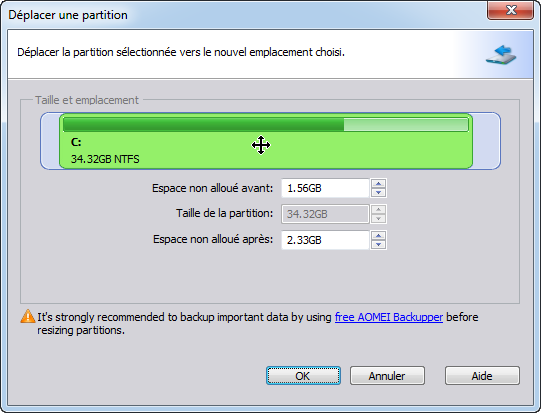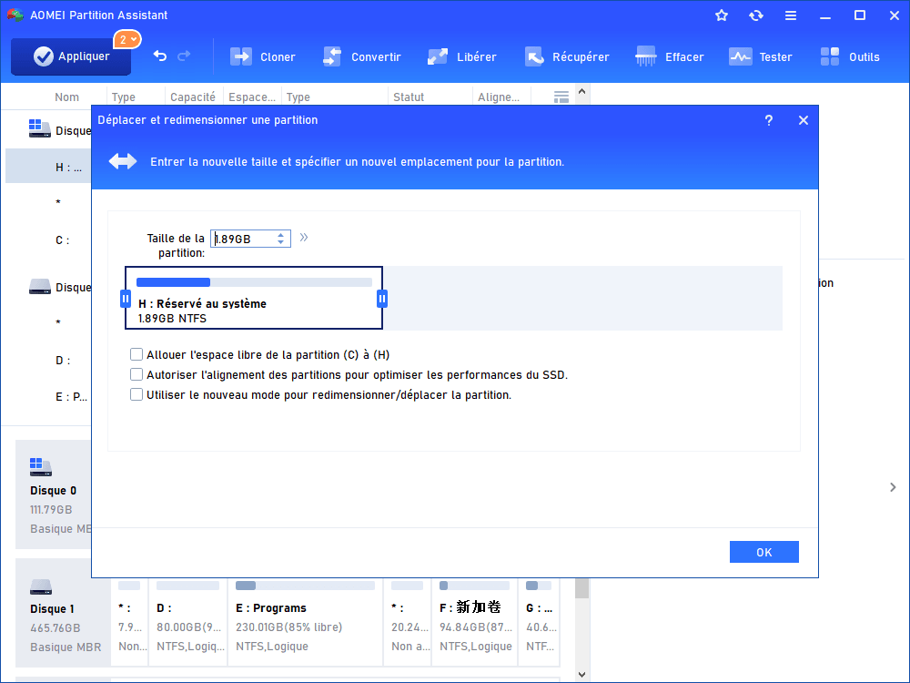 5. Cliquez avec le bouton droit sur la partition réservée au système et sélectionnez Redimensionner/déplacer la partition. Dans la fenêtre pop-up, faites glisser la barre de curseur vers la droite pour augmenter sa taille.