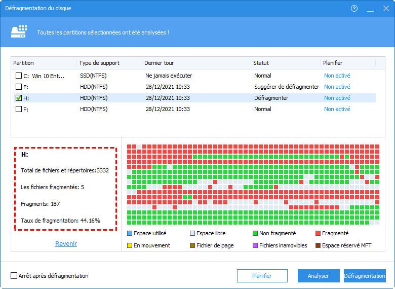 2. Sélectionnez la partition que vous souhaitez défragmenter et cliquez sur Analyser.