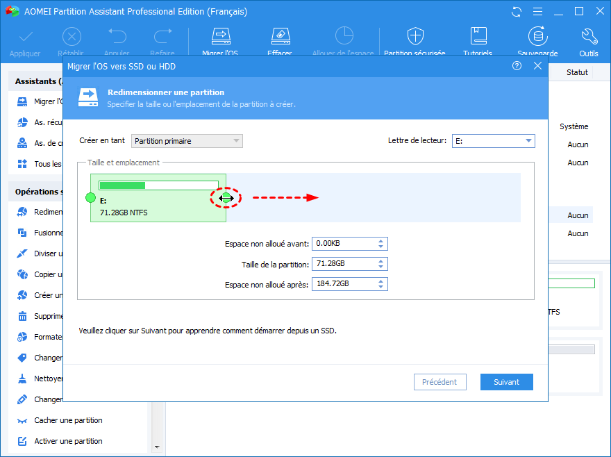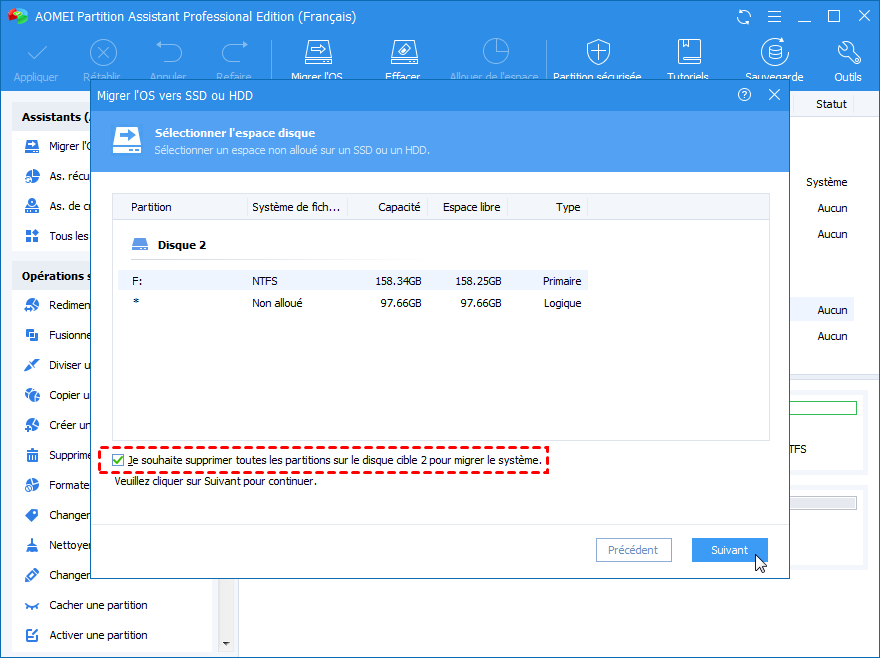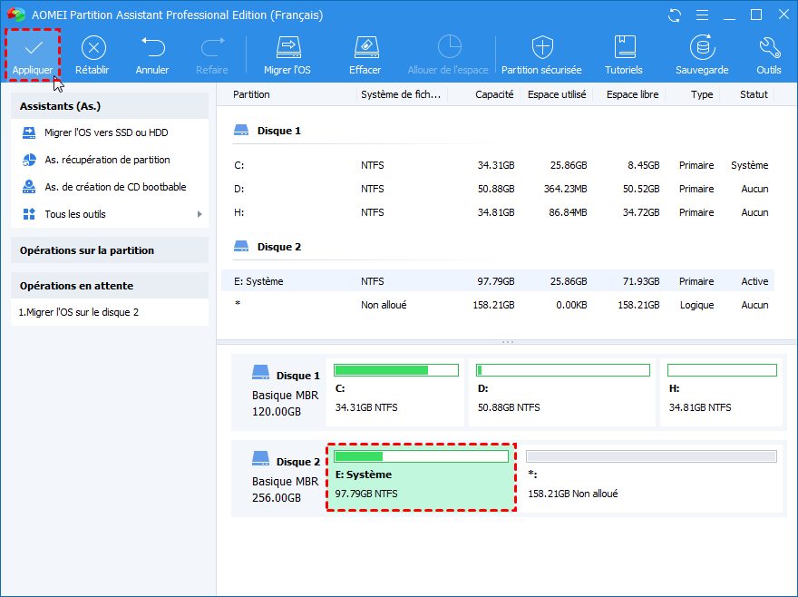 Avec AOMEI Partition Assistant Professional, vous pouvez déplacer le système avec les paramètres Windows et les applications installés vers un SSD de manière simple et rapide. D'ailleurs, si vous voulez déplacer l'ensemble des données du disque dur vers un SSD sans la réinstallation, vous pouvez directement cloner le disque dur.