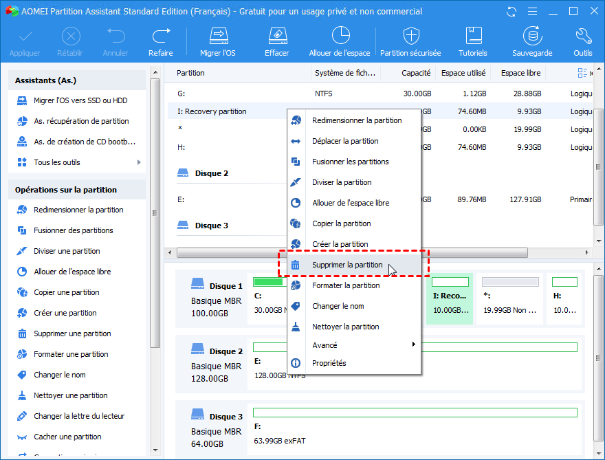 Puis-je supprimer la partition de récupération lors de l’installation de Windows 10 ? En fait, vous ne pouvez pas supprimer une partition de récupération avec Gestion des disques de Windows 10 car il a des fichiers cruciaux, mais vous pouvez utiliser diskpart.exe pour la supprimer. Cependant, vous ne pouvez encore pas étendre la partition restante avec de l'espace non alloué nouvellement créé si la partition de récupération se trouve avant la partition C. Par conséquent, vous avez besoin d'un logiciel de partition tiers pour le faire. AOMEI Partition Assistant Standard, logiciel de partition gratuit vous permet de supprimer la partition de récupération et étendre une partition facilement et en toute sécurité.
