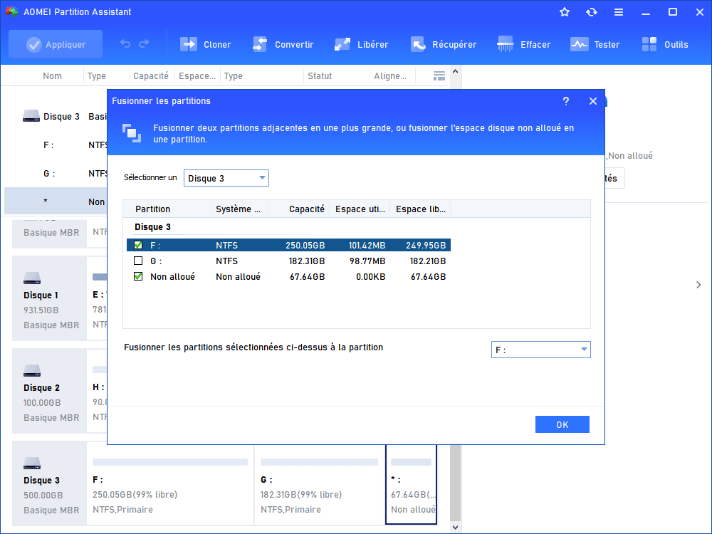 3. Cliquez sur Fusionner les partitions. Dans la fenêtre pop-up, cochez les cases avant l'espace non alloué et la partition que vous souhaitez étendre.