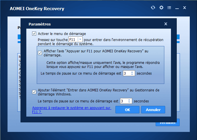 Vous pouvez utiliser AOMEI OneKey Recovery pour créer une partition de récupération sous Windows 10 afin de sauvegarder et de restaurer votre système actuel, y compris tous les programmes installés sur la partition C. Il vous permet également d'appuyer sur une touche spécifiée "F1" ou "A" pour démarrer dans l'environnement AOMEI OneKey Recovery lors du démarrage de votre ordinateur.