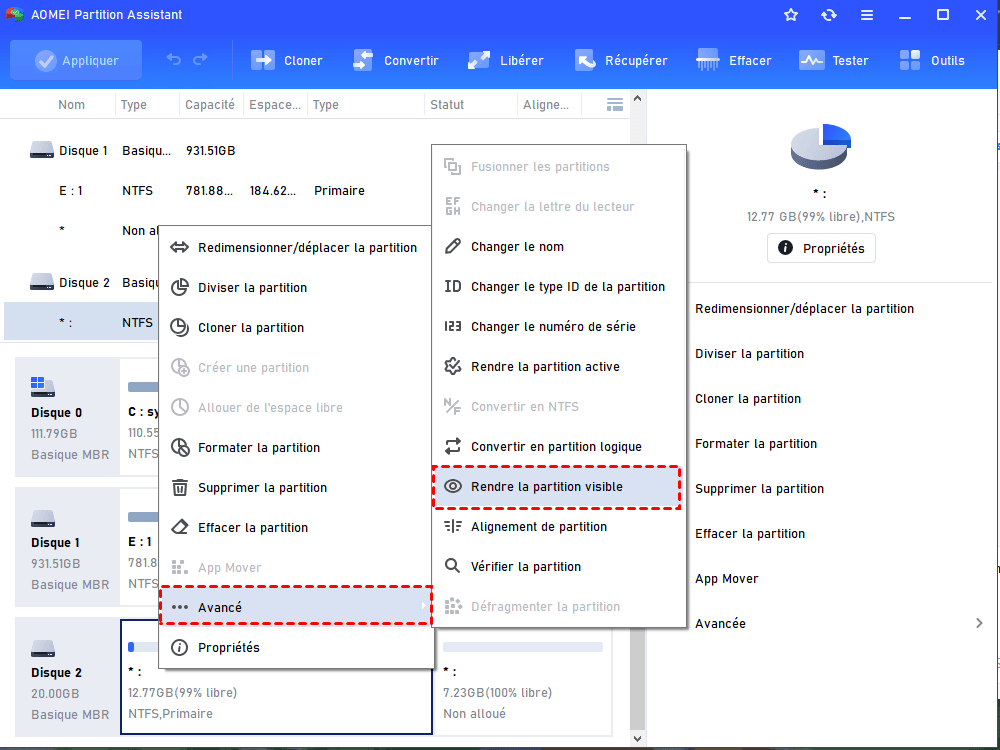 1. Dans l'interface principale, faites un clic droit sur la partition cachée et allez dans Avancé > Rendre la partition visible.