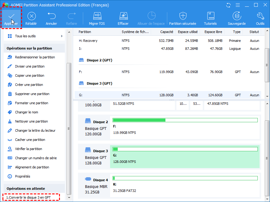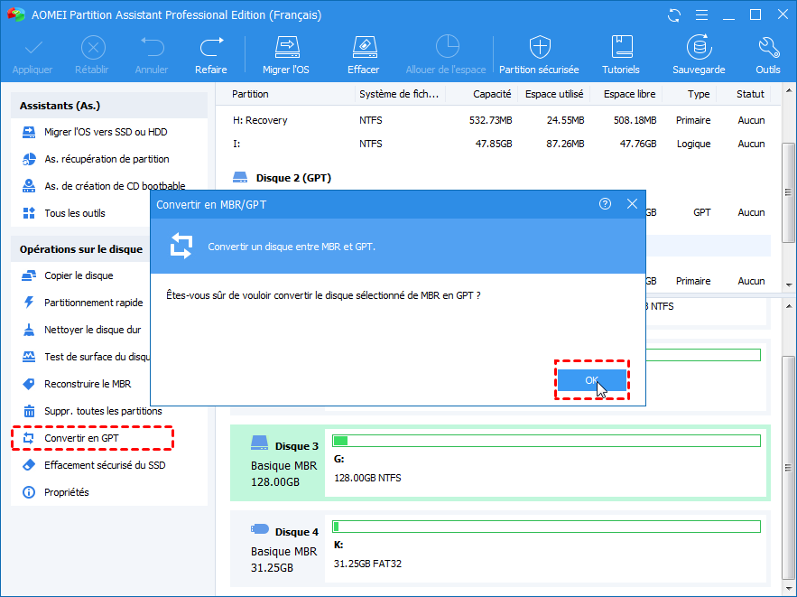 Si votre disque dur est GPT, vous pouvez aussi convertir MBT en GPT sans perte de données en utilisant un logiciel tiers, tel qu'AOMEI Partition Assistant.