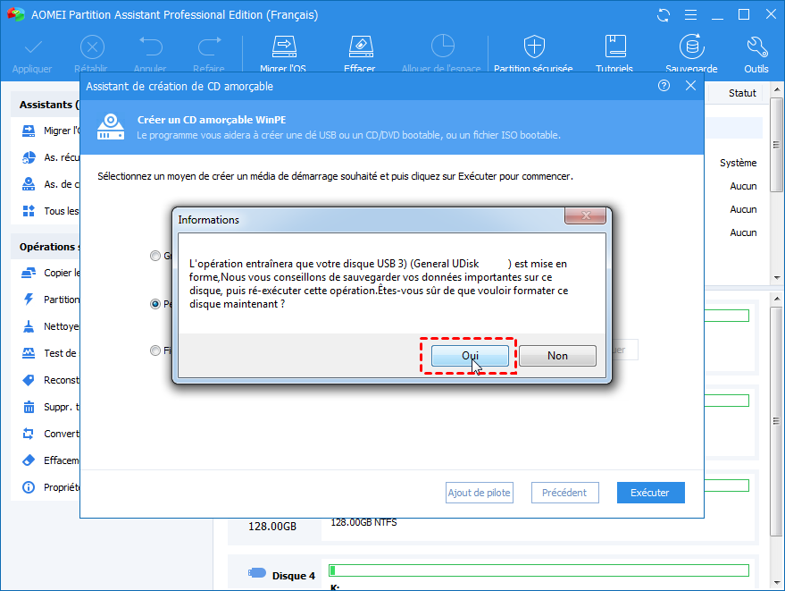 Étape 3: Ce logiciel vous demandera de sauvegarder vos fichiers importants sur le lecteur flash USB car le lecteur USB sera formaté après l'opération. Veuillez sauvegarder les données à l'avance. Ensuite, cliquez sur Oui pour commencer à créer un support de démarrage.