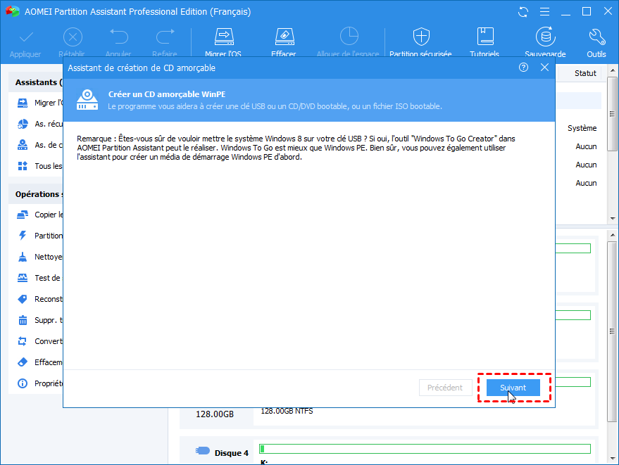 Étape 1: Connectez votre clé USB à l'ordinateur normal, installez et lancer AOMEI Partition Assistant. Sur la fenêtre principale, sélectionnez Outils en haut, et puis cliquez sur As. de création de CD bootable. Dans la fenêtre suivante, appuyez sur Suivant pour continuer.