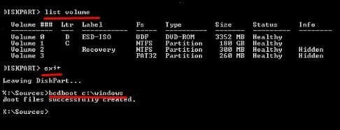 ● bcdboot m:\windows (m signifie la lettre de volume de Windows installé)