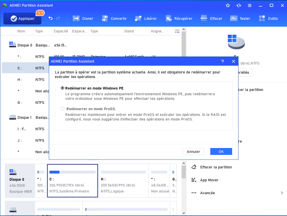 Ensuite, sélectionnez Redémarrer en mode Windows PE ou Redémarrer en mode PreOS selon vos propres besoins, puis cliquez sur OK et suivez les instructions pour terminer l'opération.