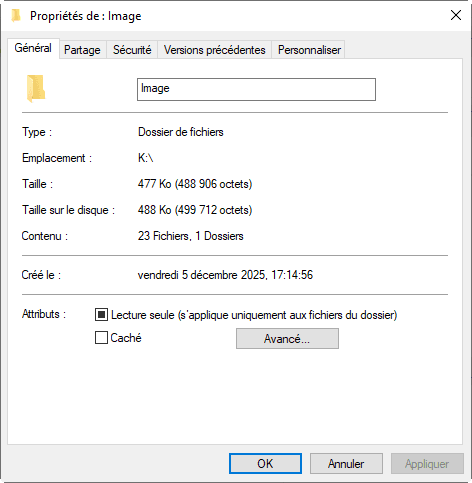 Cette manipulation fonctionne correctement pour les fichiers, mais pas pour les dossiers. La taille affichée ne correspond pas à l’ensemble du contenu du dossier (fichiers et sous-dossiers inclus).
