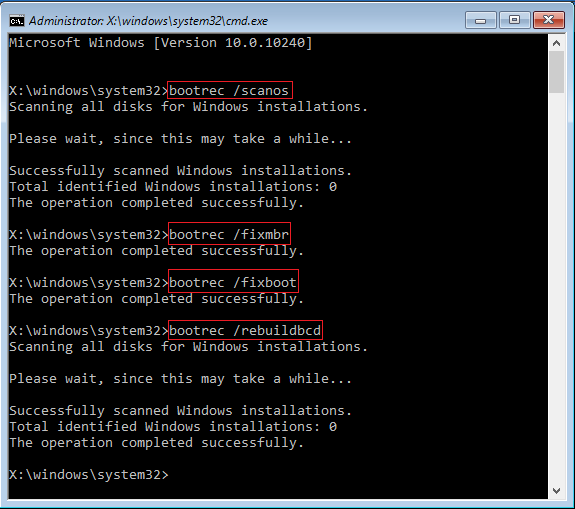 2. Vérifiez si le disque a un MBR corrompu. Vous pouvez corriger MBR de cette manière. Appeler Invite de commandes à l'aide du périphérique d'installation. Entrer les commandes suivantes: