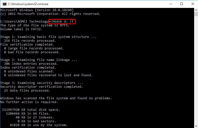 chkdsk d: / f. peut vérifier et corriger les erreurs trouvées sur le volume D.